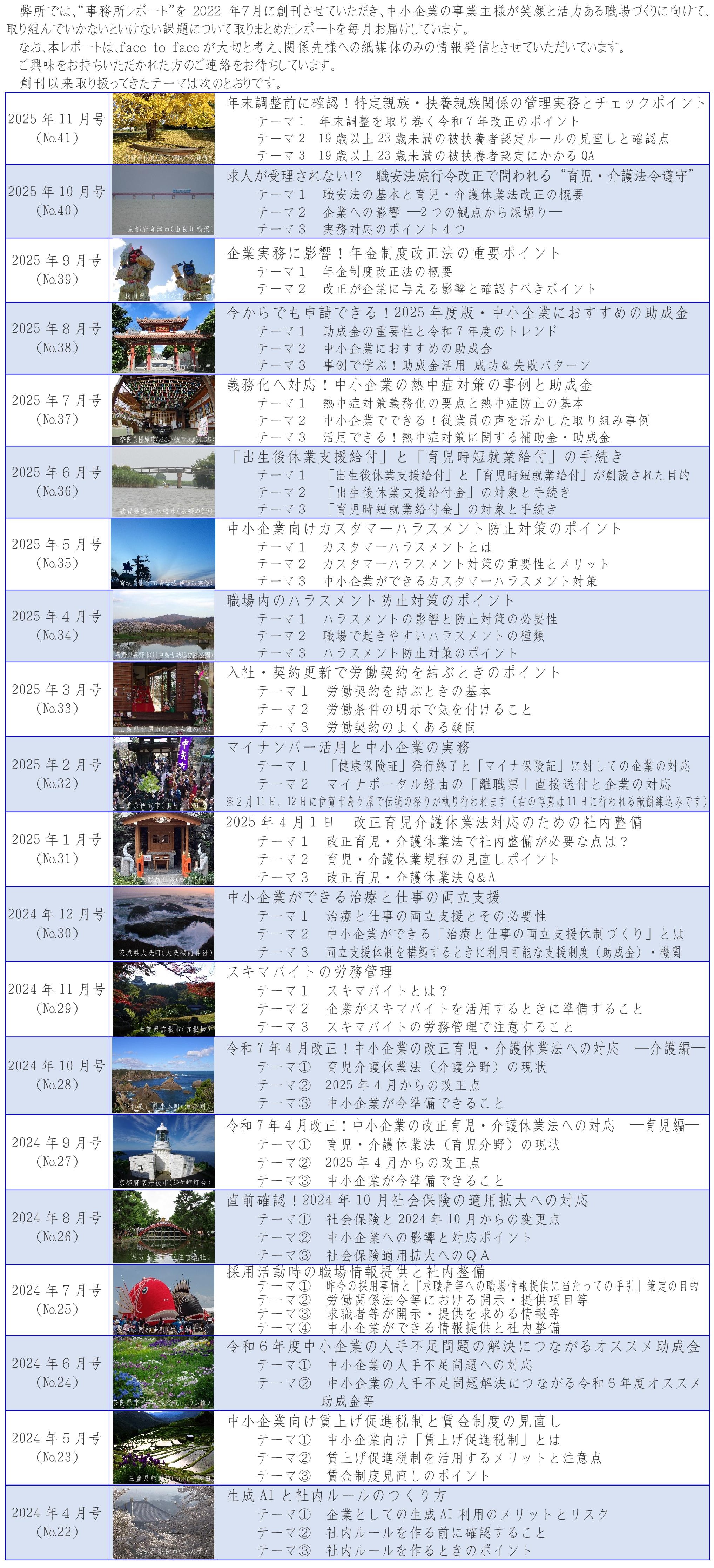 “事務所レポート” 2025年11月号(№41)を発刊いたしました。今月は、大きく改正された令和7年の年末調整と確認点などを取り上げました。(2025/10/28)