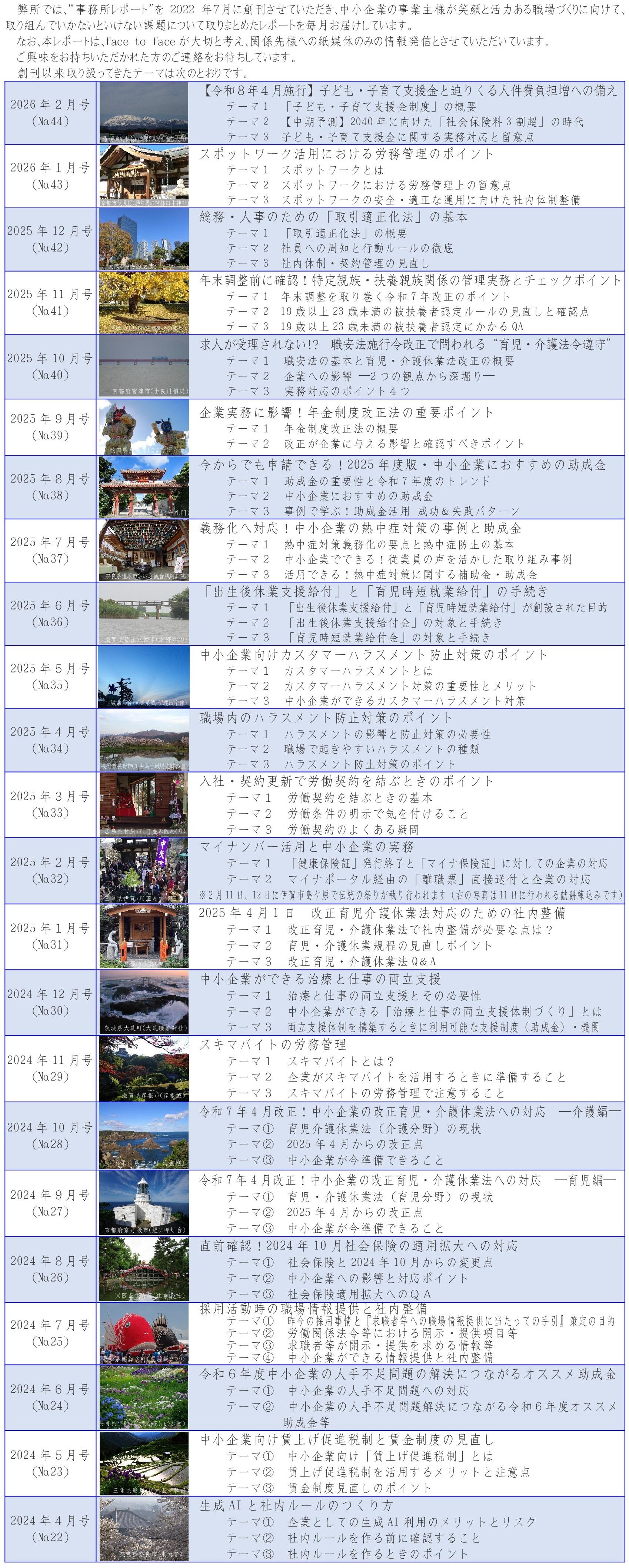 “事務所レポート” 2026年2月号(№44)を発刊いたしました。今月は、令和8年4月に施行される「子ども・子育て支援金」と迫りくる人件費負担増への備えについて取り上げました。(2026/1/25)